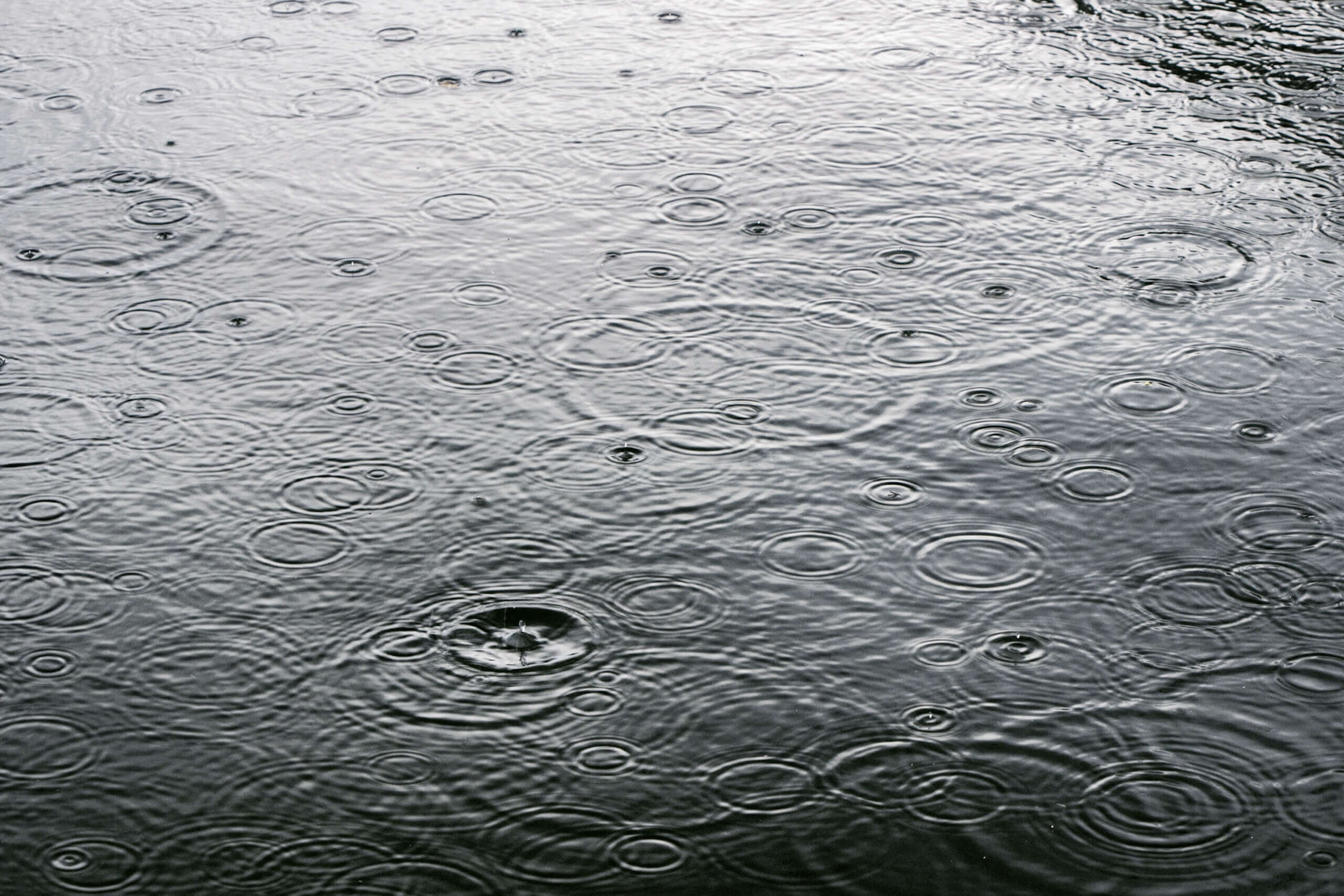 Regentropfen fallen auf die Wasseroberfläche und erzeugen kreisförmige Wellenmuster.